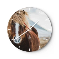 Ceas de perete - Ceas pe sticlă - Un cal maro cu o coamă deschisă la culoare pe un peisaj montan - 30x30cm - Simțiți libertatea? - Decorațiune modernă pentru perete pentru living, bucătărie și dormitor ARTTOR