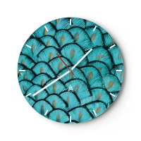 Ceas de perete - Ceas pe sticlă - Un prim-plan cu pene de păun turcoaz într-un aranjament decorativ. - 30x30cm - Marea gală a penelor - Decorațiune modernă pentru perete pentru living, bucătărie și dormitor ARTTOR
