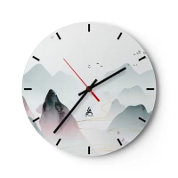 Ceas de perete - Ceas pe sticlă - Un peisaj montan minimalist în nuanțe pastelate cu păsări în zbor. - 30x30cm - Peste vârfuri - Decorațiune modernă pentru perete pentru living, bucătărie și dormitor ARTTOR