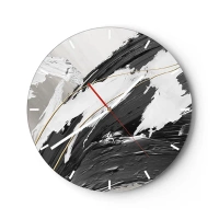 Ceas de perete - Ceas pe sticlă - Tușe dinamice de pensulă în negru, alb și gri - 30x30cm - Abstracție cu fler - Decorațiune modernă pentru perete pentru living, bucătărie și dormitor ARTTOR