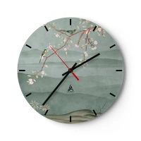 Ceas de perete - Ceas pe sticlă - O creangă cu flori și păsări pe un fundal de dealuri verzi - 30x30cm - Primăvara, ah, tu ești - Decorațiune modernă pentru perete pentru living, bucătărie și dormitor ARTTOR