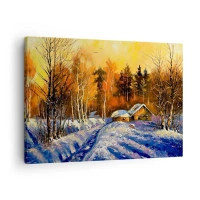 Tablou pe pânză Canvas - Peisaj de iarnă cu o casă în lumina soarelui care apune - 70x50cm - Impresie de iarnă în soare - Decorațiune modernă pentru perete pentru living și dormitor ARTTOR