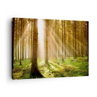 Tablou pe pânză Canvas - Pădure de conifere cu raze de soare care strălucesc printre copaci - 70x50cm - Spiridușii sunt pe cale să apară - Decorațiune modernă pentru perete pentru living și dormitor ARTTOR
