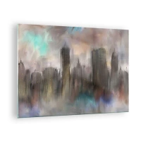 Tablou pe sticlă - Imagine abstractă a unui oraș cu zgârie-nori - 70x50cm - O compoziție de oțel, piatră și ceață - Decorațiune modernă pentru perete pentru living și dormitor ARTTOR