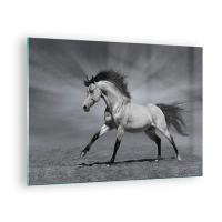 Tablou pe sticlă - O fotografie alb-negru a unui cal galopând pe un câmp deschis. - 70x50cm - Născut pentru a încânta - Decorațiune modernă pentru perete pentru living și dormitor ARTTOR