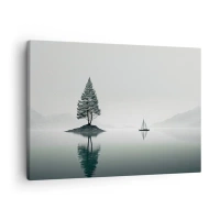 Tablou pe pânză Canvas - Un peisaj minimalist cu un copac pe o insulă și o barcă cu pânze. - 70x50cm - Visând cu ochii deschiși - Decorațiune modernă pentru perete pentru living și dormitor ARTTOR