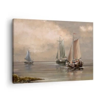 Tablou pe pânză Canvas - Bărci cu pânze pe o mare calmă într-un decor pastelat - 70x50cm - Întoarcerea marinarilor - Decorațiune modernă pentru perete pentru living și dormitor ARTTOR