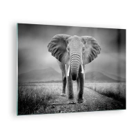 Tablou pe sticlă - Elefant în savană, în alb și negru - 70x50cm - Gazda te salută - Decorațiune modernă pentru perete pentru living și dormitor ARTTOR