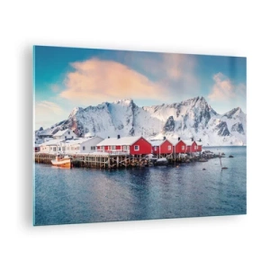 Tablou pe sticlă - Căsuțe de pescuit roșii pe fiord cu munți în fundal - 70x50cm - Retragerea nordică - Decorațiune modernă pentru perete pentru living și dormitor ARTTOR