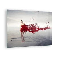 Tablou pe sticlă - Figura unei femei într-o rochie roșie pe fundalul mării - 70x50cm - Pasională ca și stacojiul - Decorațiune modernă pentru perete pentru living și dormitor ARTTOR