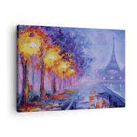 Tablou pe pânză Canvas - O stradă cu felinare în Paris, cu Turnul Eiffel în fundal - 70x50cm - O plimbare de vis - Decorațiune modernă pentru perete pentru living și dormitor ARTTOR