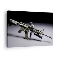 Tablou pe pânză Canvas - Armă modernă în culori de camuflaj pe fundal închis - 70x50cm - Întotdeauna amenințătoare - Decorațiune modernă pentru perete pentru living și dormitor ARTTOR