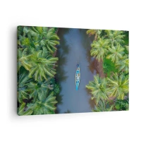 Tablou pe pânză Canvas - O vedere de sus a unei bărci pe un râu înconjurată de palmieri - 70x50cm - Pe traseul tropical - Decorațiune modernă pentru perete pentru living și dormitor ARTTOR