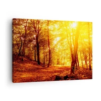 Tablou pe pânză Canvas - O potecă de pădure înconjurată de copaci aurii și verzi - 70x50cm - Tăcere de aur de pădure - Decorațiune modernă pentru perete pentru living și dormitor ARTTOR