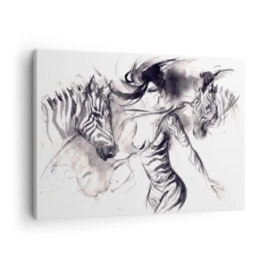 Tablou pe pânză Canvas - O femeie într-un dans dinamic cu zebre într-o estetică alb-negru - 70x50cm - Dansând cu zebrele - Decorațiune modernă pentru perete pentru living și dormitor ARTTOR