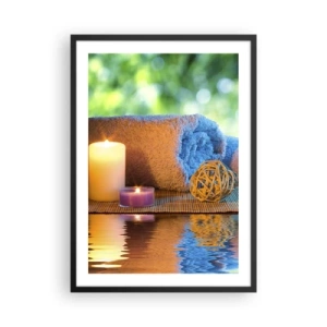 Poster în ramă neagră - Lumânări și un prosop pe fundalul unui peisaj natural - 50x70cm - Timp pentru corp - Decorațiune modernă pentru perete pentru living și dormitor ARTTOR