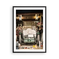 Poster în ramă neagră - O mașină de epocă într-un garaj înconjurată de unelte - 50x70cm - Înapoi în trecut - Decorațiune modernă pentru perete pentru living și dormitor ARTTOR