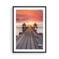 Poster în ramă neagră - Un dig de lemn cu soarele apunând peste apă în fundal - 50x70cm - Vestul la est - Decorațiune modernă pentru perete pentru living și dormitor ARTTOR
