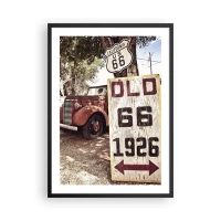 Poster în ramă neagră - Oldtimer la indicatorul Route 66 - 50x70cm - O legendă provincială americană - Decorațiune modernă pentru perete pentru living și dormitor ARTTOR