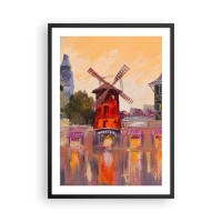Poster în ramă neagră - O interpretare picturală a celebrei mori de vânt pe fundalul orașului - 50x70cm - Icoane pariziene - Moulin Rouge - Decorațiune modernă pentru perete pentru living și dormitor ARTTOR