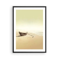 Poster în ramă neagră - O barcă singuratică din lemn pe o plajă pustie, în culori pastelate. - 50x70cm - O amintire din Mările Sudului - Decorațiune modernă pentru perete pentru living și dormitor ARTTOR