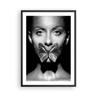 Poster în ramă neagră - Portret de femeie cu un fluture pe buze, alb-negru - 50x70cm - Sărut de fluture - Decorațiune modernă pentru perete pentru living și dormitor ARTTOR