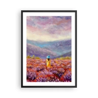 Poster în ramă neagră - Un câmp de lavandă cu o femeie purtând o pălărie pe fundalul unui munte. - 50x70cm - Într-o lume de lavandă - Decorațiune modernă pentru perete pentru living și dormitor ARTTOR