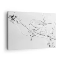 Tablou pe pânză Canvas - Pasăre pe o creangă în alb și negru, cu un stil minimalist - 70x50cm - Dimineață de iarnă - Decorațiune modernă pentru perete pentru living și dormitor ARTTOR