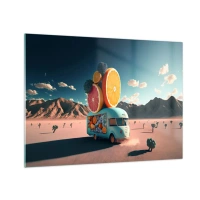 Tablou pe sticlă - O rulotă turcoaz cu fructe pe fundalul unui peisaj deșertic - 70x50cm - Gustul vacanței - Decorațiune modernă pentru perete pentru living și dormitor ARTTOR