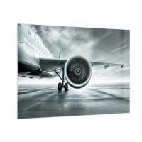 Tablou pe sticlă - Turbina unui avion de pasageri pe pistă în zori - 70x50cm - Ce putere! - Decorațiune modernă pentru perete pentru living și dormitor ARTTOR