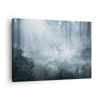 Tablou pe pânză Canvas - Un cerb într-o pădure densă învăluită în ceața dimineții - 70x50cm - Plimbarea de dimineață prin regat - Decorațiune modernă pentru perete pentru living și dormitor ARTTOR