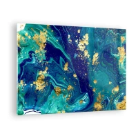 Tablou pe sticlă - Un model abstract în nuanțe de turcoaz și bleumarin cu accente aurii - 70x50cm - Petale de soare - Decorațiune modernă pentru perete pentru living și dormitor ARTTOR
