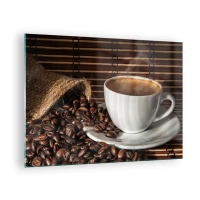 Tablou pe sticlă - O ceașcă de cafea cu boabe pe un fundal rustic - 70x50cm - Negru de cărbune, transparență de chihlimbar - Decorațiune modernă pentru perete pentru living și dormitor ARTTOR