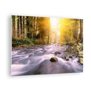 Tablou pe sticlă - Pârâu de pădure în lumina soarelui - 70x50cm - Malachit în rame de argint și aur - Decorațiune modernă pentru perete pentru living și dormitor ARTTOR