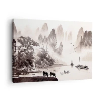 Tablou pe pânză Canvas - Un peisaj pitoresc în stil asiatic, cu munți învăluiți în ceață - 70x50cm - Viața exotică de zi cu zi a Estului - Decorațiune modernă pentru perete pentru living și dormitor ARTTOR