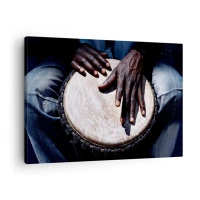 Tablou pe pânză Canvas - Mâini cântând la o tobă djembe într-o compoziție dinamică - 70x50cm - Trăiește în ritmul tău - Decorațiune modernă pentru perete pentru living și dormitor ARTTOR