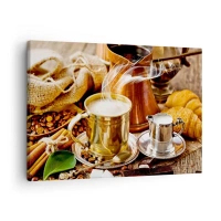 Tablou pe pânză Canvas - O cană de cafea aurie înconjurată de boabe, ulcioare și croissante - 70x50cm - O zi bună! - Decorațiune modernă pentru perete pentru living și dormitor ARTTOR