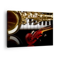 Tablou pe pânză Canvas - Un saxofon auriu, clape de pian și o vioară roșie - 70x50cm - Tablă, lemn și fildeș - Decorațiune modernă pentru perete pentru living și dormitor ARTTOR
