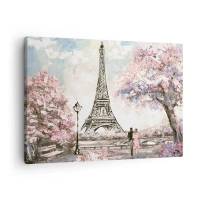 Tablou pe pânză Canvas - Turnul Eiffel înconjurat de copaci înfloriți - 70x50cm - Plimbare în aprilie la Paris - Decorațiune modernă pentru perete pentru living și dormitor ARTTOR