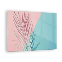 Tablou pe sticlă - O frunză de palmier pe un fundal pastel într-o compoziție geometrică - 70x50cm - Impresie tropicală - Decorațiune modernă pentru perete pentru living și dormitor ARTTOR