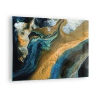 Tablou pe sticlă - Compoziție abstractă în nuanțe de albastru și auriu - 70x50cm - Albastru - galben - influență reciprocă - Decorațiune modernă pentru perete pentru living și dormitor ARTTOR