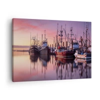 Tablou pe pânză Canvas - Bărci de pescuit în port la apus - 70x50cm - Înainte de o zi plină - Decorațiune modernă pentru perete pentru living și dormitor ARTTOR