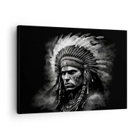 Tablou pe pânză Canvas - Portretul unui șef într-o coafură cu pene pe un fundal negru - 70x50cm - Conducător și luptător - Decorațiune modernă pentru perete pentru living și dormitor ARTTOR