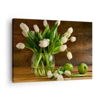 Tablou pe pânză Canvas - Un buchet de lalele albe într-o vază de sticlă cu mere verzi - 70x50cm - Suculente și proaspete în verde și alb - Decorațiune modernă pentru perete pentru living și dormitor ARTTOR