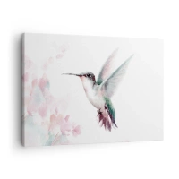 Tablou pe pânză Canvas - O colibri în culori pastelate delicate pe un fundal de flori - 70x50cm - Oprit în mișcare - Decorațiune modernă pentru perete pentru living și dormitor ARTTOR