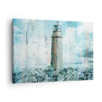 Tablou pe pânză Canvas - Un far pe o coastă stâncoasă în culori pastelate - 70x50cm - Pe lemn vechi - Decorațiune modernă pentru perete pentru living și dormitor ARTTOR