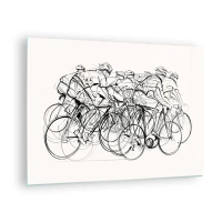Tablou pe sticlă - Schiță a unui grup de cicliști în timpul unei curse pe un fundal alb - 70x50cm - Mână în mână - Decorațiune modernă pentru perete pentru living și dormitor ARTTOR