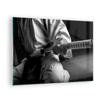 Tablou pe sticlă - O figură într-un kimono care ține o sabie, compoziție alb-negru - 70x50cm - Sufletul unui războinic - Decorațiune modernă pentru perete pentru living și dormitor ARTTOR