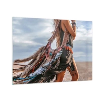 Tablou pe sticlă - Femeie în stil boho cu pene și decorațiuni pe un fundal deșertic - 70x50cm - Iubita șamanului - Decorațiune modernă pentru perete pentru living și dormitor ARTTOR