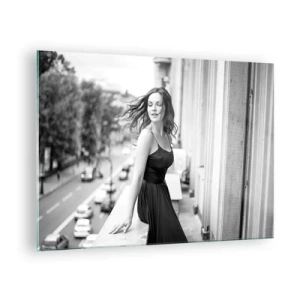 Tablou pe sticlă - O femeie într-o rochie neagră pe un balcon în stil parizian - 70x50cm - Cu siguranță e o fată pariziană - Decorațiune modernă pentru perete pentru living și dormitor ARTTOR